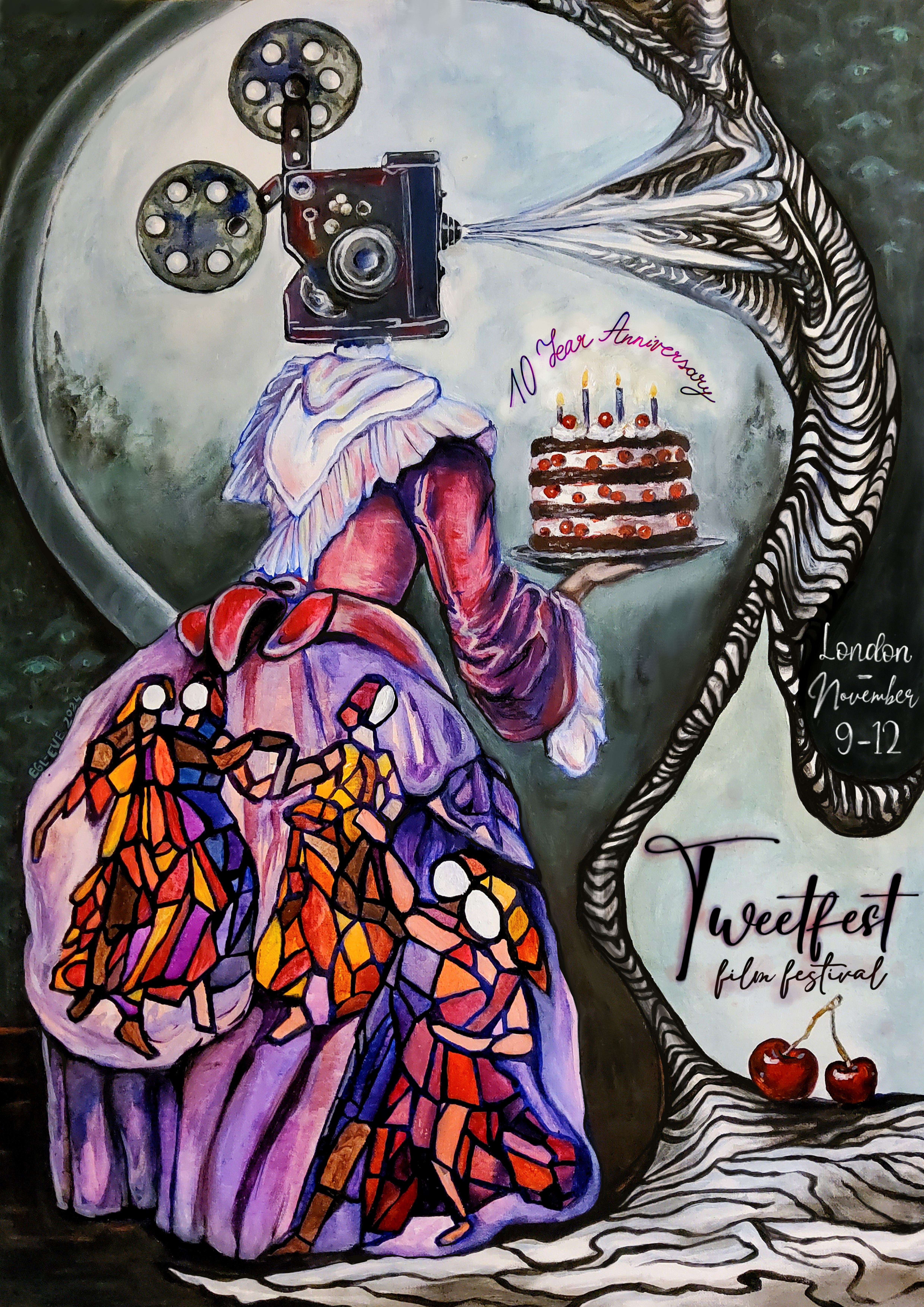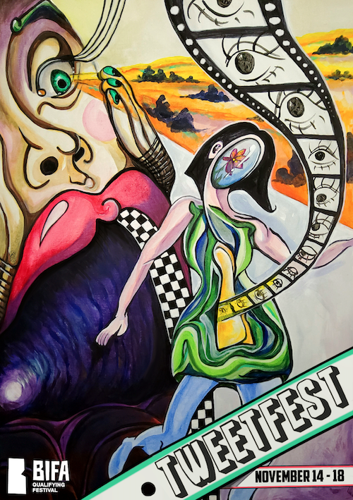 My name is Egle-Evergreen Radziute. I am a surrealist artist and I’ve had the joy of creating the official Tweetfest Film Festival posters for the last three years. Each edition has been a chance to challenge myself as an artist and create something timeless for a great cause.